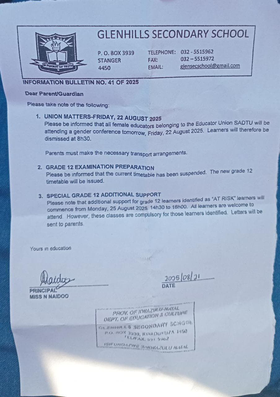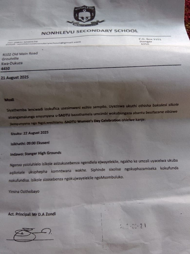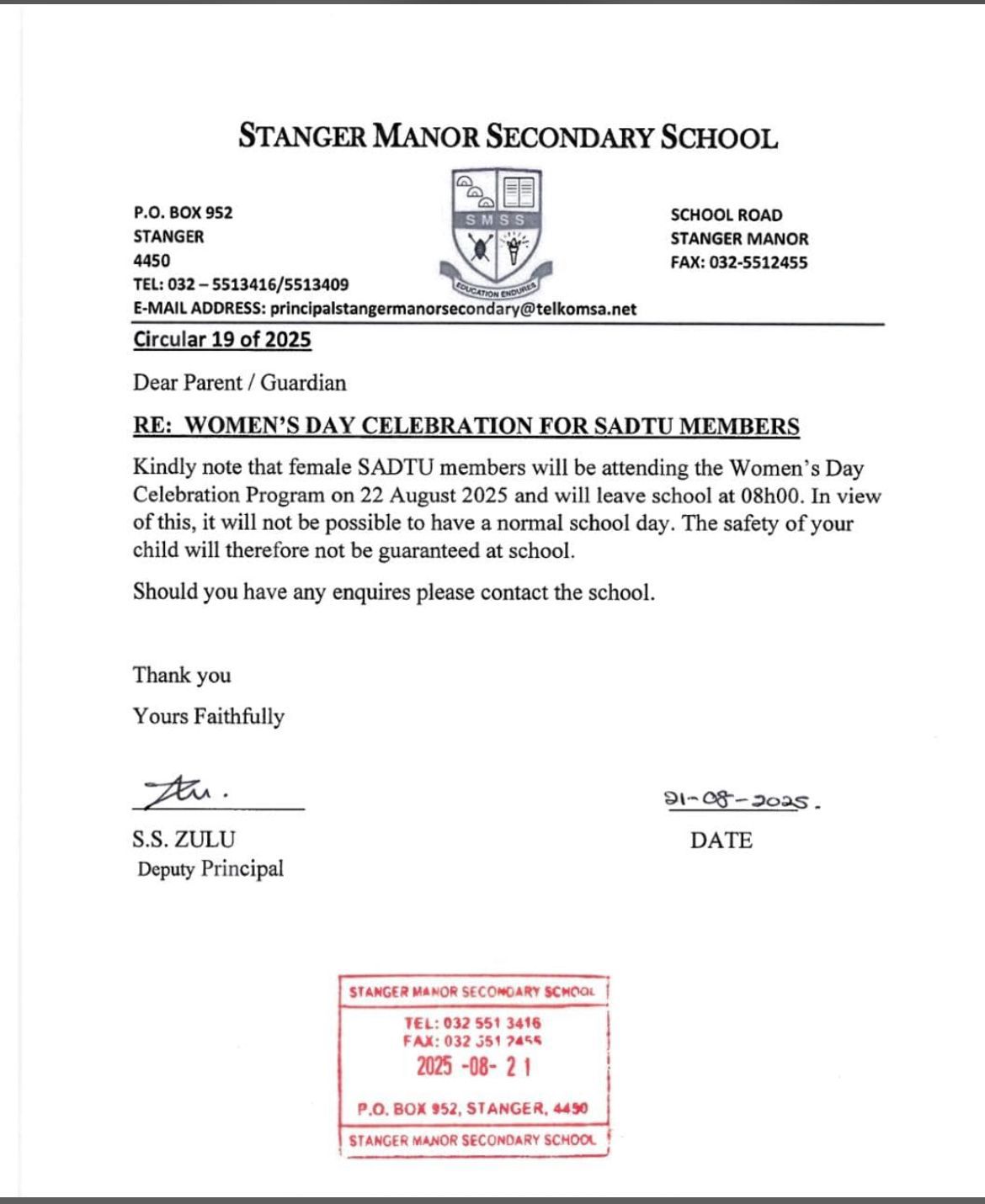Circulars issued by both Stanger Manor Secondary School (view here), Nonhlevu Secondary School (view here), also in Stanger, and Glenhills Primary School (view here) in KwaDukuza have confirmed that the majority of female SADTU members will abandon their teaching duties to attend the event at Stanger High.